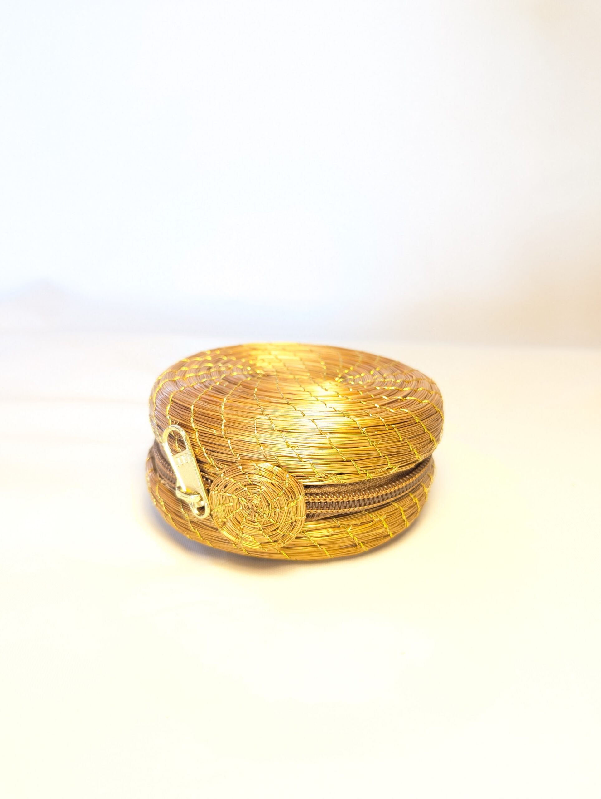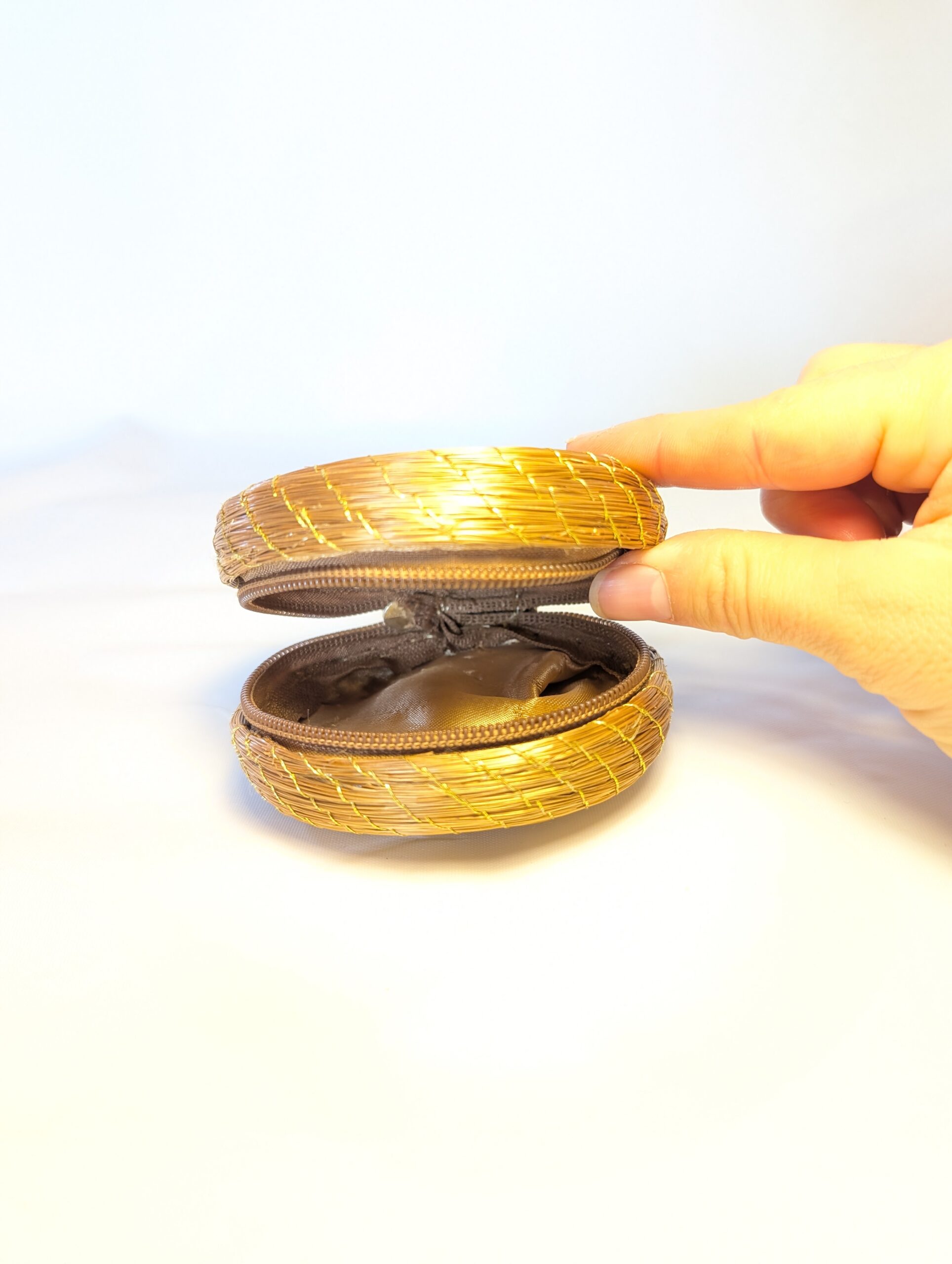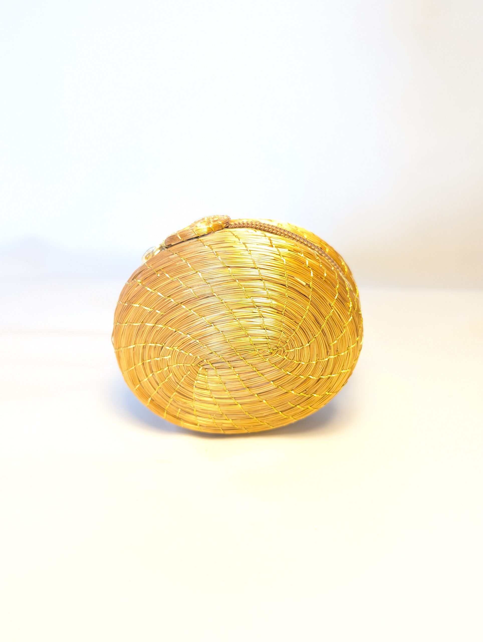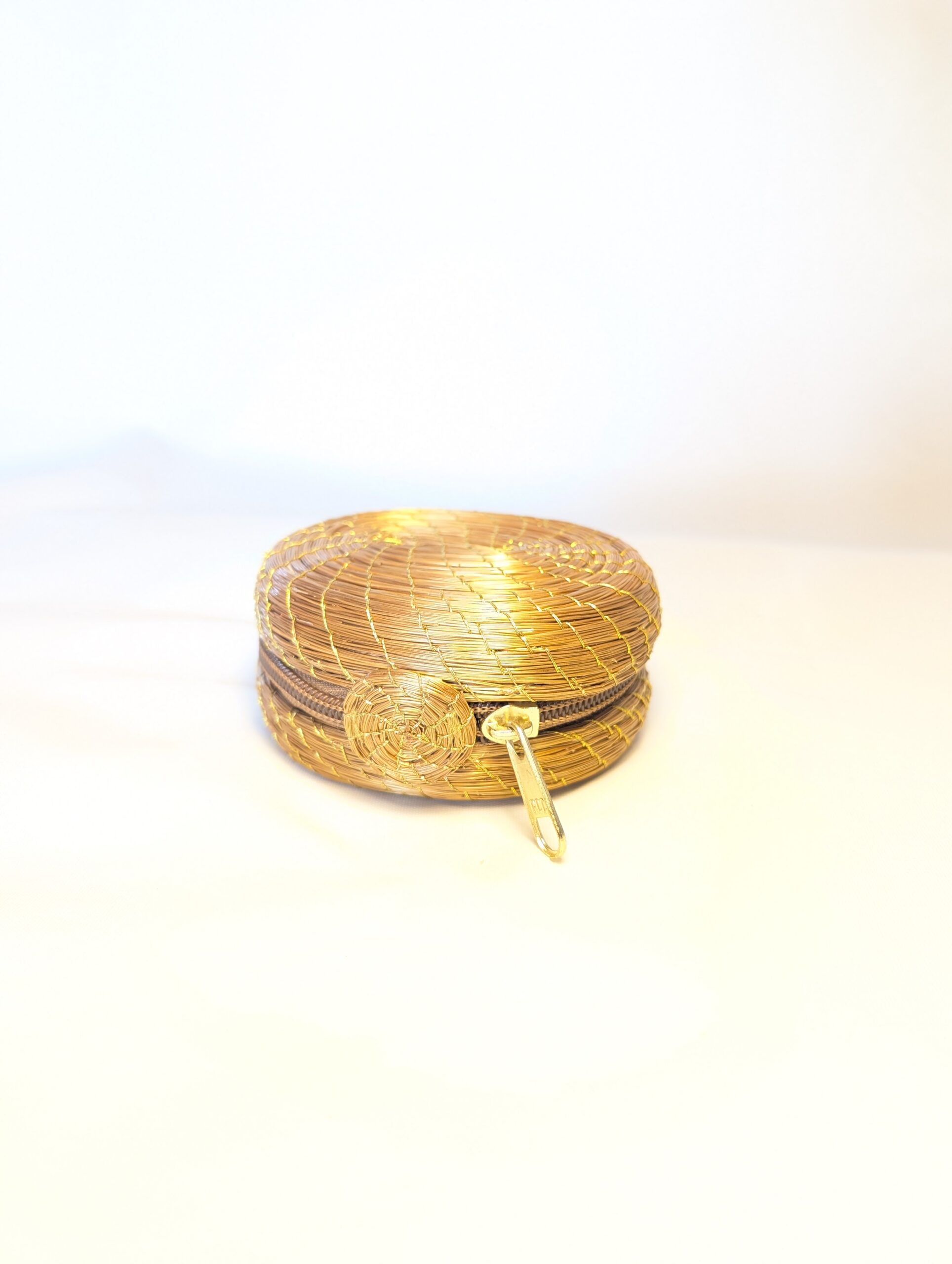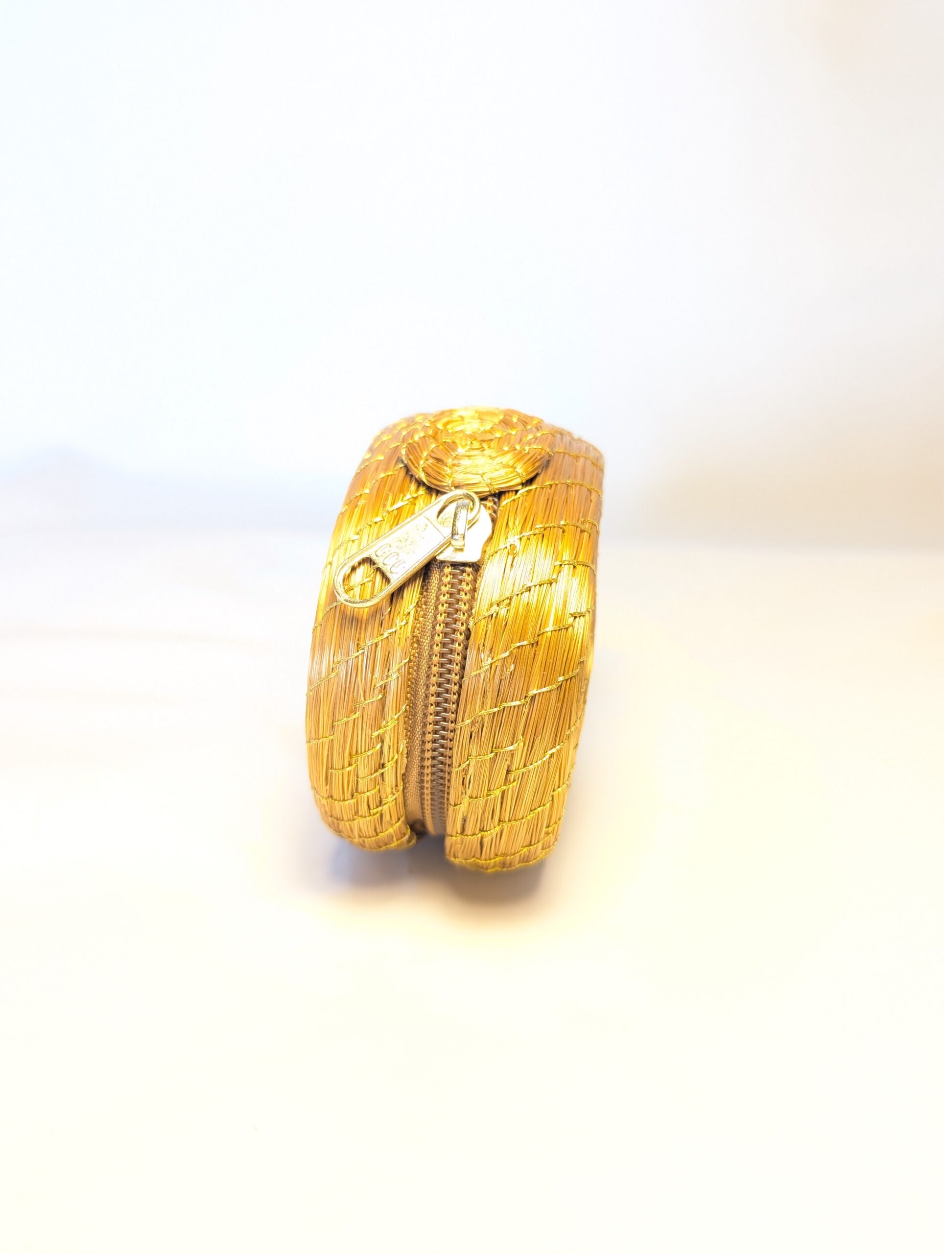 Pequeña cajita artesanal trenzada con capim dourado, la planta brasileña conocida como “oro vegetal” por su brillo natural. Su forma ovalada y su acabado luminoso la convierten en un accesorio práctico y elegante.