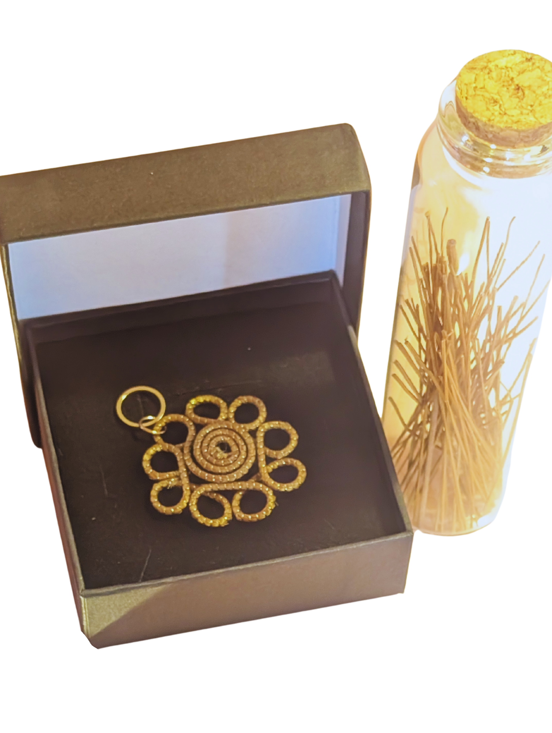 Son colgantes dorados de capim dorado, el oro vegetal brasileño. Joyería natural hecha 100% a mano con la famosa hierba dorada (Brasil).