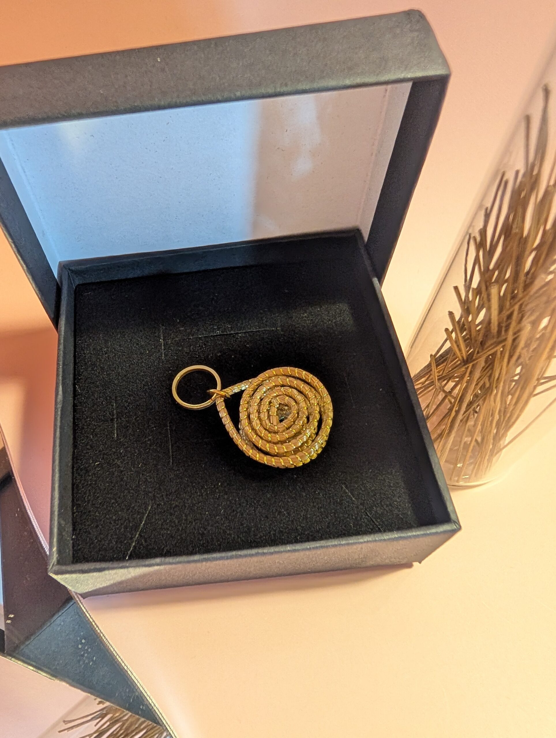 Los Capimix son colgantes multiusos de oro vegetal, elaborados a mano con capim dourado, una planta brasileña conocida por su brillo natural.